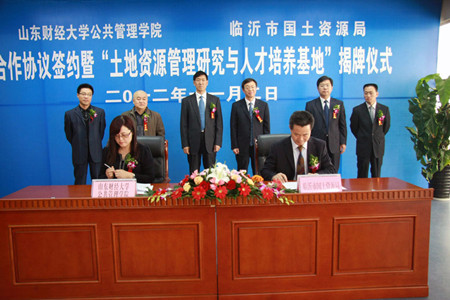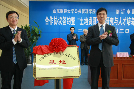 与临沂市国土资源局全面合作协议签约暨“土地资源管理研究与人才培养基地”揭牌仪式在临沂举行。校党委副书记、纪委书记牟思伦教授出席签约仪式,为临沂市国土资源局李彦普局长颁发了客座教授聘任证书,并与李彦普局长共同为“土地资源管理研究与人才培养基地”揭牌。探花视频