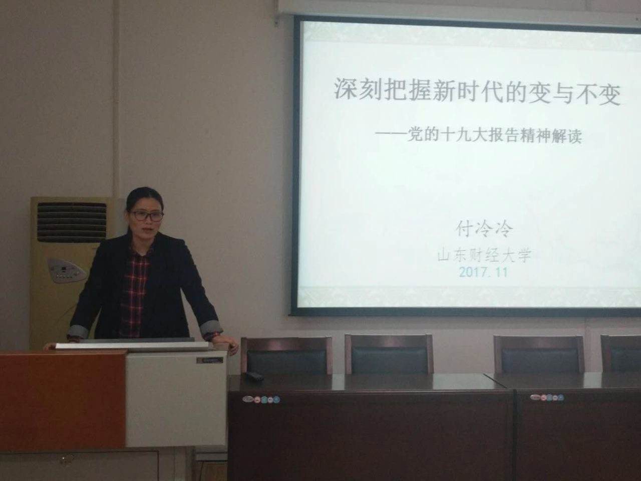 付老师还从“经济取得巨大成就、全面深化改革取得重大突破、民主法治建设迈出重大步伐、人民生活不断改善” “我国社会主要矛盾的变化、实现第一个百年奋斗目标和向第二个百年奋斗目标进军、坚定不移全面从严治党”等多方面深刻的阐释和解读了党的十八大以来党和国家事业发生的历史性变革,并详细介绍了我们党在十八大以来在反腐方面取得的巨大成就,指出中国特色社会主义已经进入一个承前启后、继往开来的新时代,准确把握了中国特色社会主义进入新时代的重要意义。