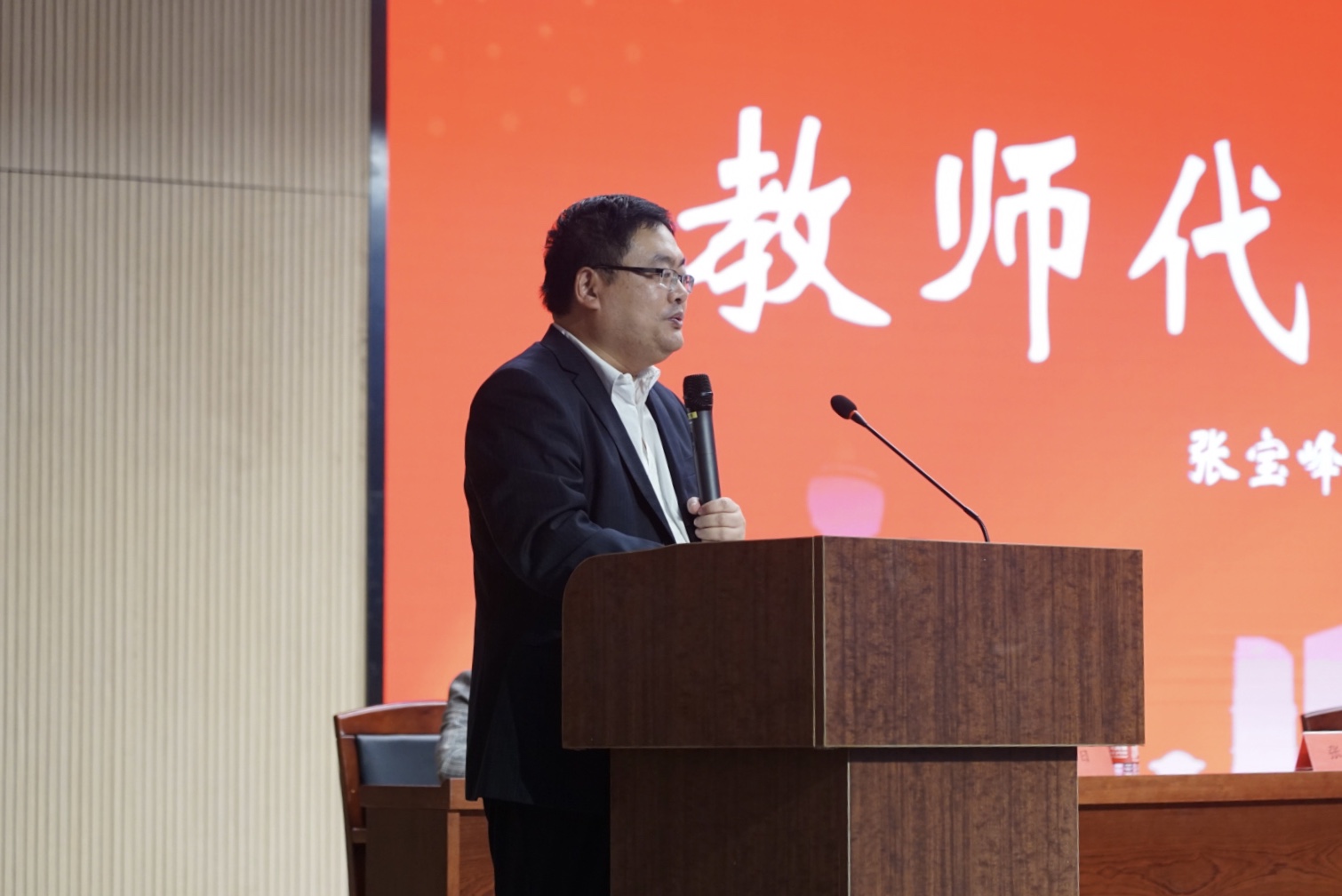 教师代表、政府管理系主任张宝峰老师讲话。张宝峰老师指出,当今世界正面临前所未有之大变局,公共事务的治理已经开始发生重大变化,因而作为公共管理学科的学生,看待事物要立足于大背景、大视野、大格局,把握住历史机遇。基于此点,张老师提出对新生的三点要求:时刻保持优秀品性和独立自主的能力、做好对学业和未来的规划,以及持之以恒、坚持不懈地追求目标。