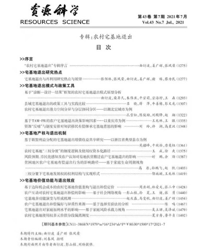 曲衍波教授作为客座主编,在《资源科学》上组织的“农村宅基地退出”专刊出版。该期刊为我校的A2类期刊。该专刊聚焦“宅基地退出研究热点”“宅基地退出模式与政策工具”“宅基地产权与退出机制”“宅基地价值功能与退出效应”4个领域,邀请了国内50多位同行学者,撰写了17篇论文。