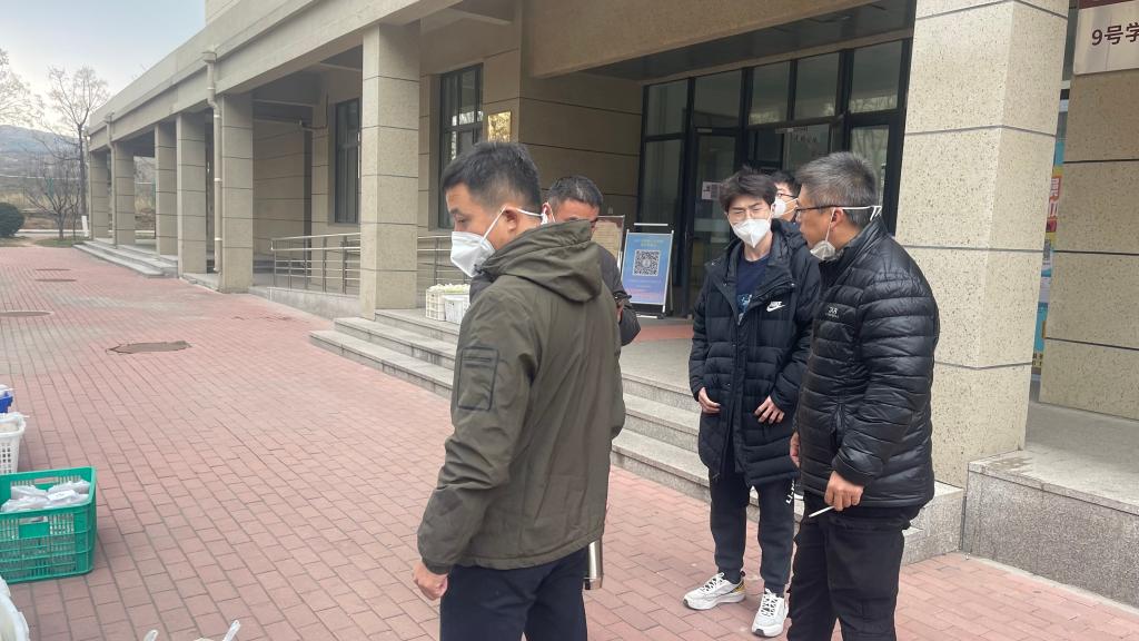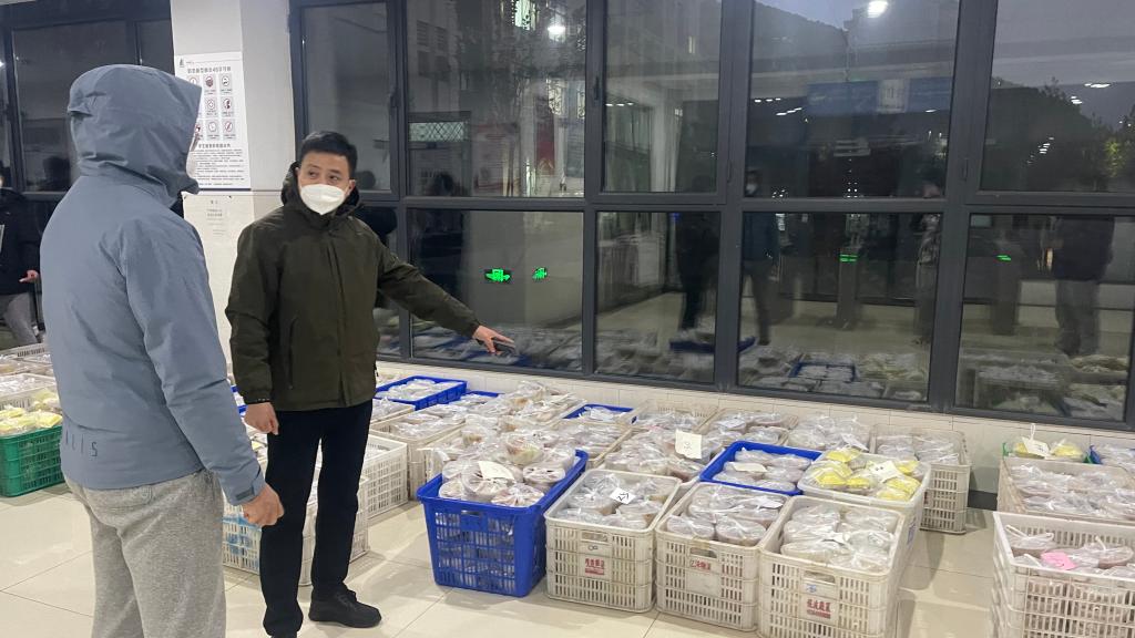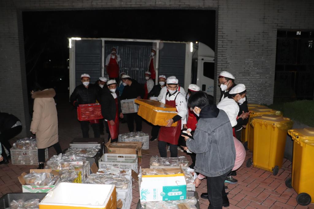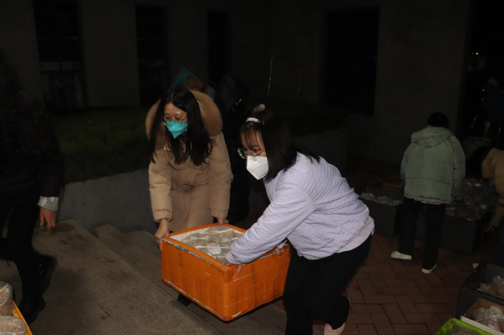 积极响应,辅导员进行组织安排。老师们提前在宿舍楼下就位,准备接餐工作。其中,张辉和张志斌分别在九号楼和四号楼处负责男、女生分餐工作,与楼层长做好对接。接下来,楼层长有序通知舍长到宿舍楼下领取,最终舍长将饭菜分发到每位同学手中,确保每位同学都能及时吃到健康可口的饭菜。一份份饭菜传递手中,使同学们深刻感受到“隔离不隔情,暖人更暖心”的深刻含义。