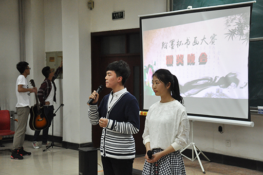 晚会在一首古朴典雅的民乐合奏《青花瓷》中拉开序幕,为晚会营造了优雅清新的氛围。随后主持人宣布了经过激烈角逐、脱颖而出的二十三名获奖选手名单。其中叶珍珠、杨书琪、司慧斌、贺靓、梁秀粉、 杨馨蕊荣获一等奖, 王正、李昭、马春浩、颜华峰、曹小龙、张兢、王雅琪、鹿文静荣获二等奖,而三等奖由高艺文、孟红、马骏、 孙银、于淦、连娇蓓、宁倩玉、于洁、欧阳崇欣等同学获得。各位获奖选手分别上台为大家分享了自己的获奖作品并交流了自己的书画创作经验。晚会中穿插的单人吉他独奏节目《突然好想你》,声音质朴、饱含深情;魔术表演《心理骇客》引得观众连连叫好,赞叹不已。最后,校书画协会的会长上台做比赛总结。