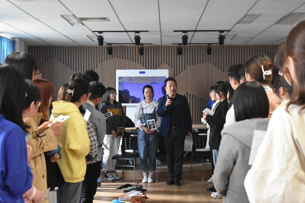 随后,刘洪涛用彩纱在活动现成铺就了一条色彩斑斓的“时光河流”,并将他设计原创的百余张展示着我们革命先辈、历史事件、英模人物、革命圣地等形象的彩色图卡——《红卡》呈现其上。他带领同学们跟随一张张红卡,将一桩桩重要事件简明而生动的进行阐述。他以马思主义在中国的传播、马克思主义中国化的历史进程等为线索,配合短视频,为同学们呈现出一个个遥远又贴近、平凡又伟岸的鲜活历史瞬间,使同学们在回顾与思考中深受触动。