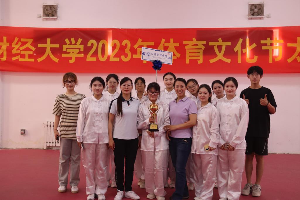 代表队作为第三个队伍上场。队员们按照3×3的队列上场,面向评委席中间,以特殊队形散开,站定,向观众和评委敬礼。随着音乐响起,队员们入境放松,展示了急缓相间,行云流水的太极拳术,意、气、形、神逐渐融为一体,可谓“妙手一运一太极,太极一运化乌有”。经过评委打分,学院获得团体“第四名”的好成绩,孙欣宜获“最佳个人奖”。