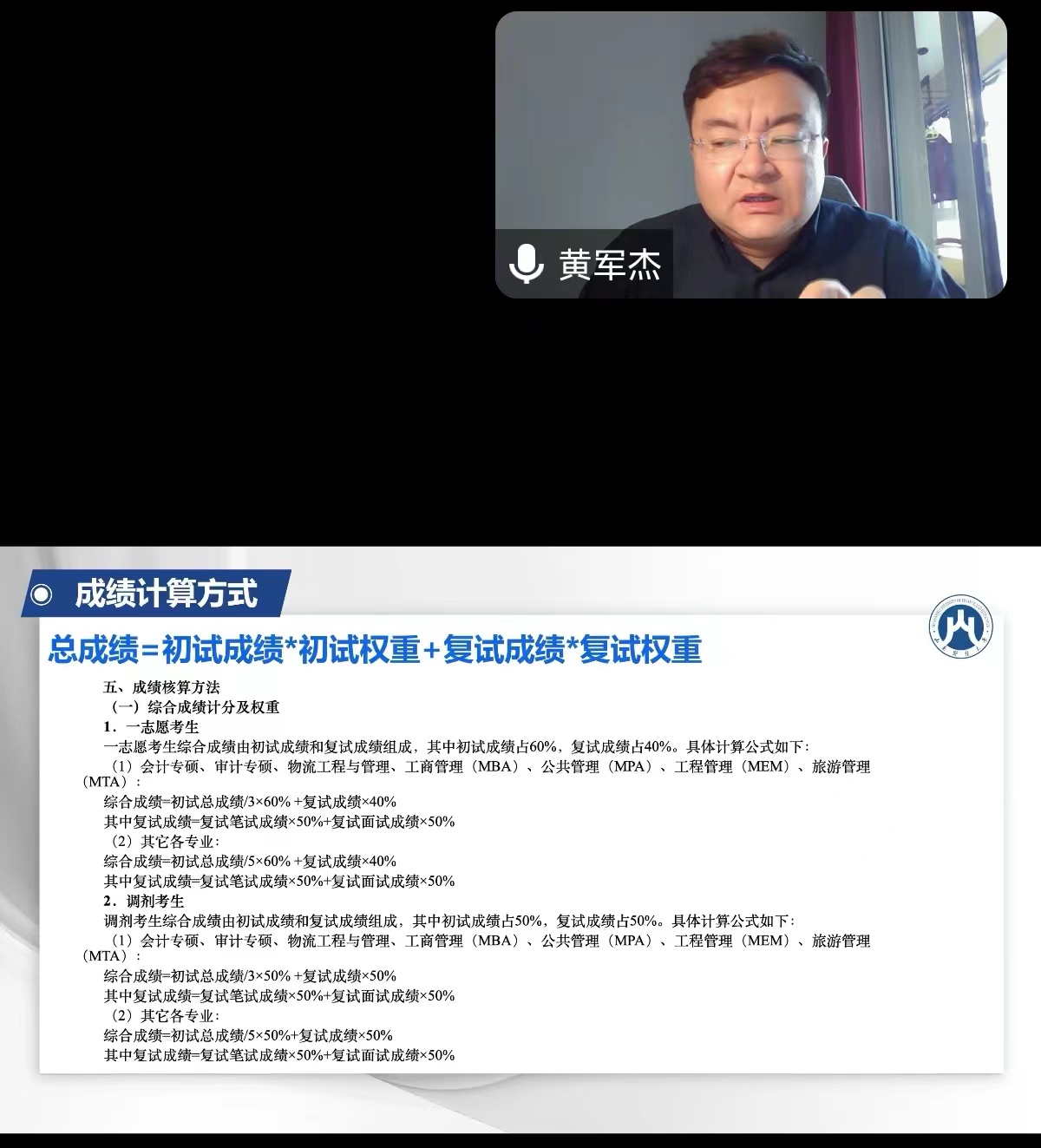 黄军杰就考研复试指导与礼仪技巧、调剂规则与调剂流程、现阶段复试与调剂准备思路等内容进行展开,强调了考研复试的重要时间节点、复试考试内容、成绩计算方式、复试面试形式、调剂资格和流程等重要注意事项,为毕业生在考研复试和调剂等方面存在的疑难问题答疑解惑。过程中,黄老师的讲解严谨细致,风趣幽默,得到了同学们的热情反响。