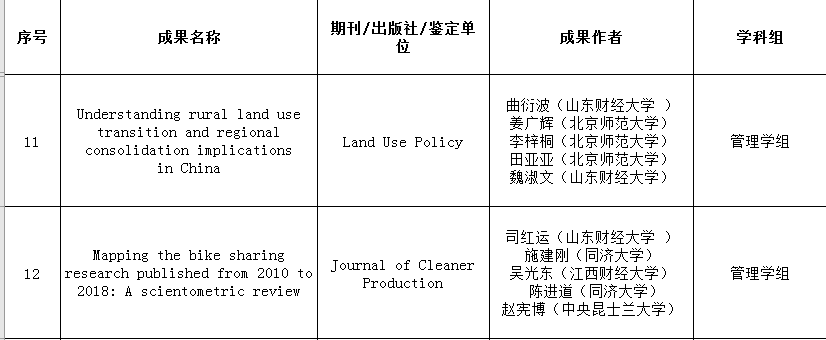 曲衍波教授的《Understanding rural land use transition and regional consolidation implications in China》、司红运教授的《Mapping the bike sharing research published from 2010 to 2018: A scientometric review》两项成果均获山东省第三十六届社会科学优秀成果奖三等奖。