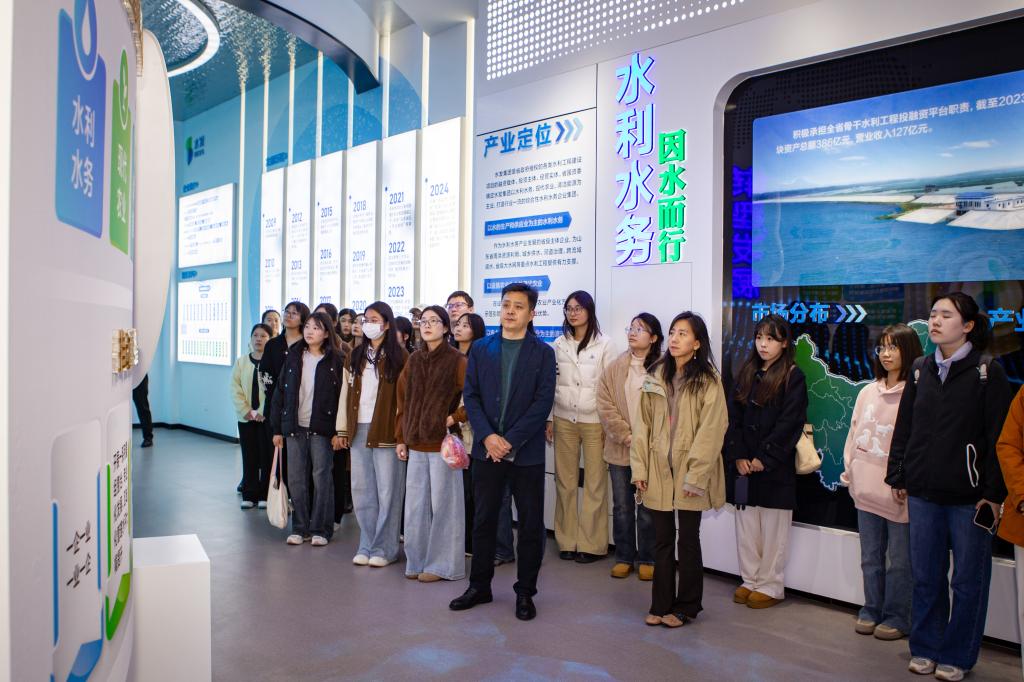 在集团工作人员的陪同下,师生代表一行首先参观了水发集团改革发展展厅,系统了解了集团在水利开发、现代农业、清洁能源等核心领域的发展历程、业务布局与创新成果。通过详实的图文资料与典型案例展示,同学们对集团探花视频、行业前沿动态以及国家相关战略部署有了更加直观深入的认知,为未来职业规划积累了宝贵的行业经验。