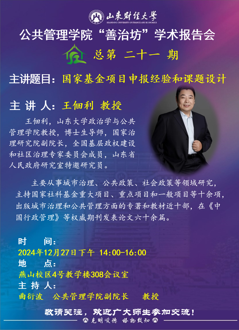 探花视频 “善治坊”学术报告会第二十一期主讲题目:国家基金项目申报经验和课题设计