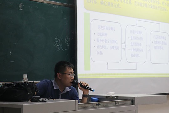 此次宣讲会的主题是“群众满意度的数据收集与处理方法”,王龙老师从数据收集步骤和方法分析介绍两个方面进行深入剖析。他指出,数据收集应分三个步骤,分别是问卷设计、各题项权重确定和各题项平均分对应权重并加和。王龙老师强调从准备到实施的过程中要分阶段进行,并明确了每个阶段应完成的任务。除此之外,他还向同学们讲解了基本的街头拦截访问方式,并分享了利用网络平台生成二维码制作微信问卷的新型调查方式。活动过程中,王龙老师用自己精心制作的PPT向同学们讲解了“三千计划”需要注意的问题,同学们认真听讲,仔细记录,积极与老师互动,现场一片轻松向上的氛围。