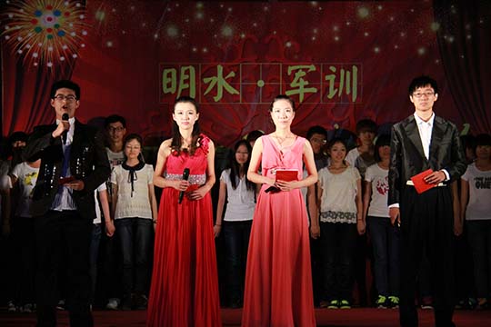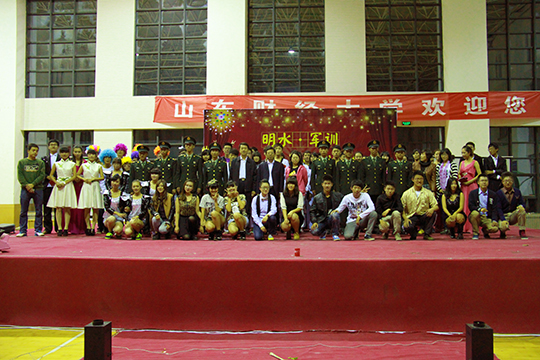 “金秋十月,欢歌笑语”10月20日晚,探花视频 与国际交流学院共同举办的2013级军训联欢晚会在明水体育馆隆重举行。学院党总支书记王有志、党总支副书记周炎、辅导员张辉,国际交流学院党总支副书记张红艳、辅导员王坤,军训团五营八名教官以及两个学院的800多名新生参加了本次晚会。