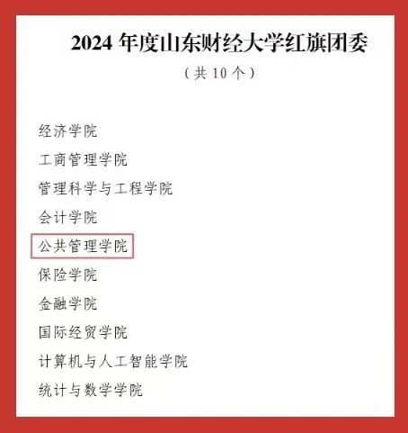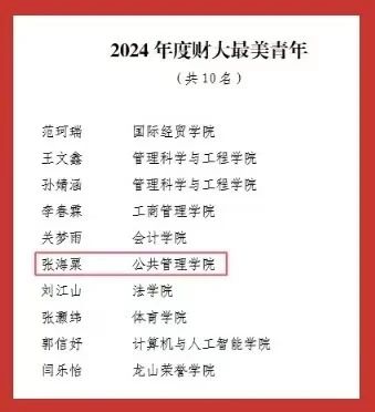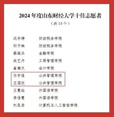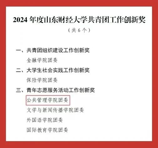 “红旗团委”“共青团工作创新奖”两大集体荣誉;2022级行政管理专业创新实验班团支部荣获学校“先进团支部”称号。个人荣誉方面,张海粟获评“财大最美青年”;任宇佳、庄煜欣获评学校“十佳志愿者”;王超获评学校“十佳志愿服务工作者”;庄凯盈等4名同学获评学校“优秀志愿者”。此外,40名师生获学校“优秀共青团干部”称号,96名学生获学校“优秀共青团员”称号,充分展现出公管学院青年群体昂扬向上的精神风貌。