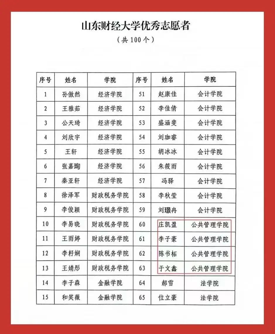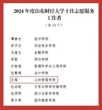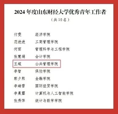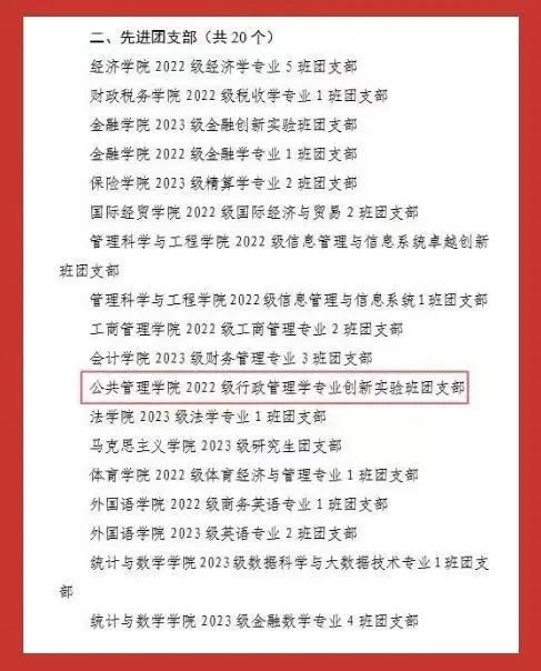 “红旗团委”“共青团工作创新奖”两大集体荣誉;2022级行政管理专业创新实验班团支部荣获学校“先进团支部”称号。个人荣誉方面,张海粟获评“财大最美青年”;任宇佳、庄煜欣获评学校“十佳志愿者”;王超获评学校“十佳志愿服务工作者”;庄凯盈等4名同学获评学校“优秀志愿者”。此外,40名师生获学校“优秀共青团干部”称号,96名学生获学校“优秀共青团员”称号,充分展现出公管学院青年群体昂扬向上的精神风貌。